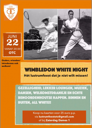 Zaterdag 22 juni vanaf 20.00 uur op OTC: Wimbledon White! Hét lustrumfeest dat je niet wilt missen! Gezelligheid, lekker lounchen, ♫, dansen, goede drankjes en echte Benoordenhoutse happen. Binnen en buiten, all white please!