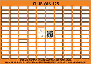 Met de Club van 125 wil de Lustrumcommissie tijdens het lustrumjaar 125 x €125 binnenhalen om daarmee nieuw meubilair voor het terras en de banen aan te schaffen. En jij kunt hieraan bijdragen! Dat kun je alleen doen, als bedrijf, als familie, als team, als commissie, noem het maar op. Alle leden van de Club van 125 komen op het bord in het clubhuis. Doe jij ook mee?